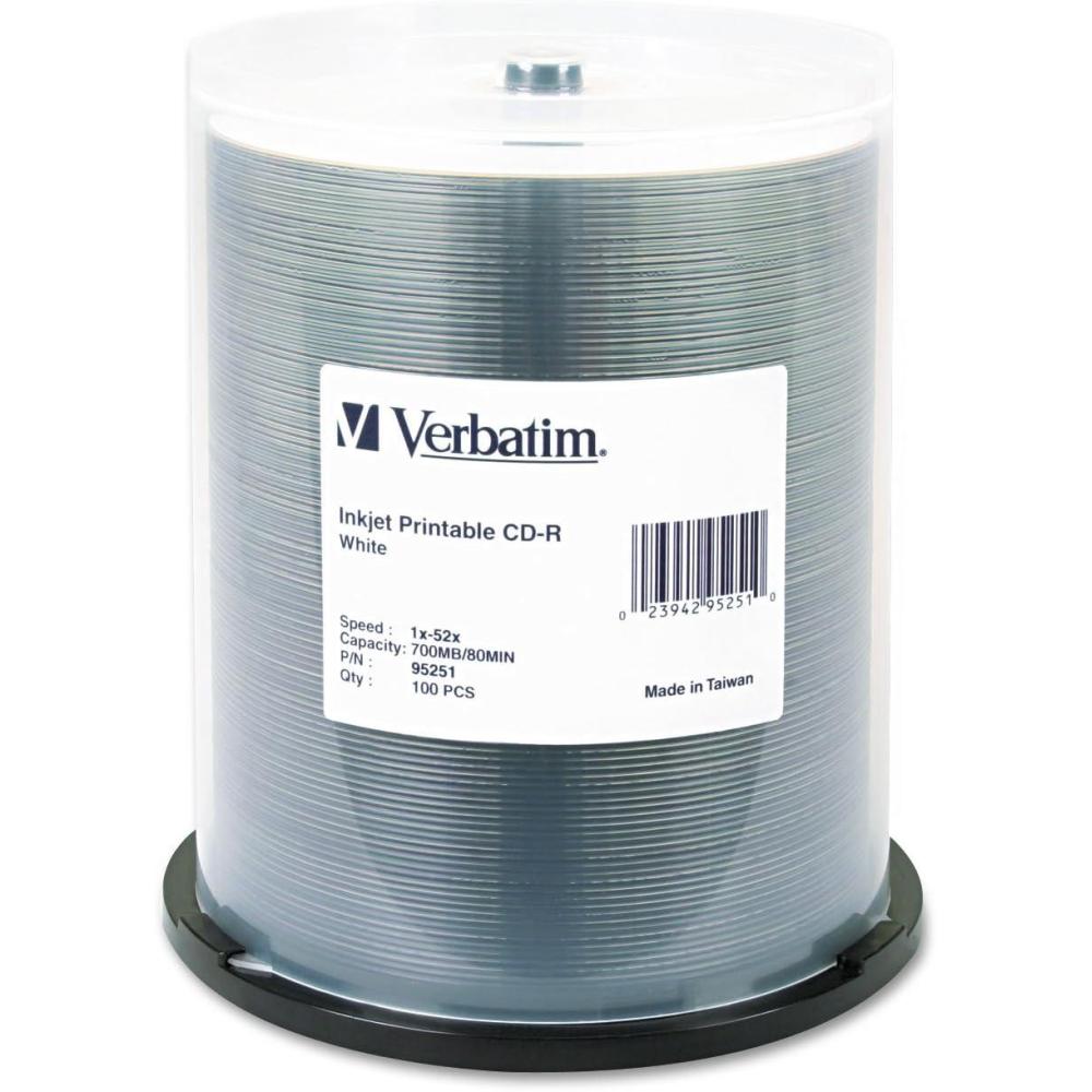 Verbatim CD-R 700MB 52X White Inkjet Hub Printable Recordable Media Disc - 100pk Spindle(White Printable)