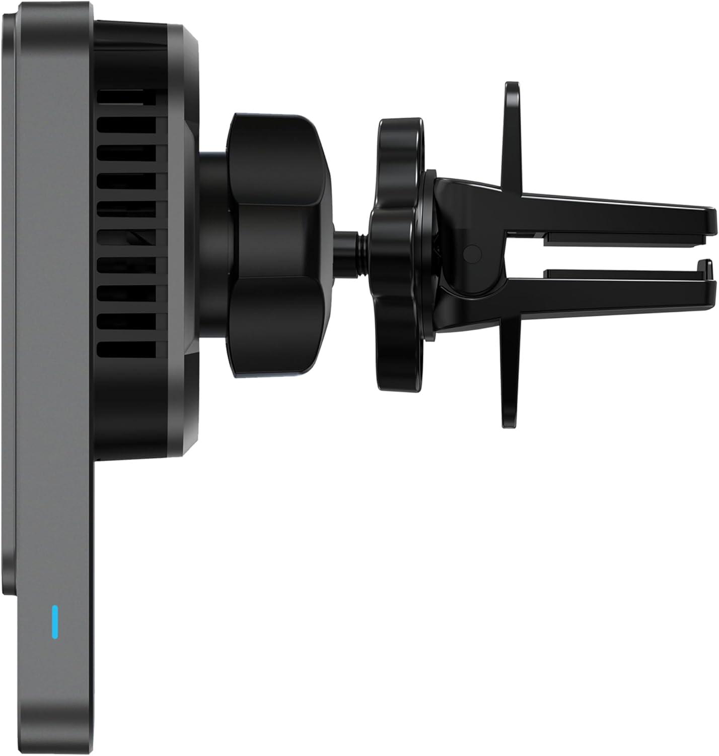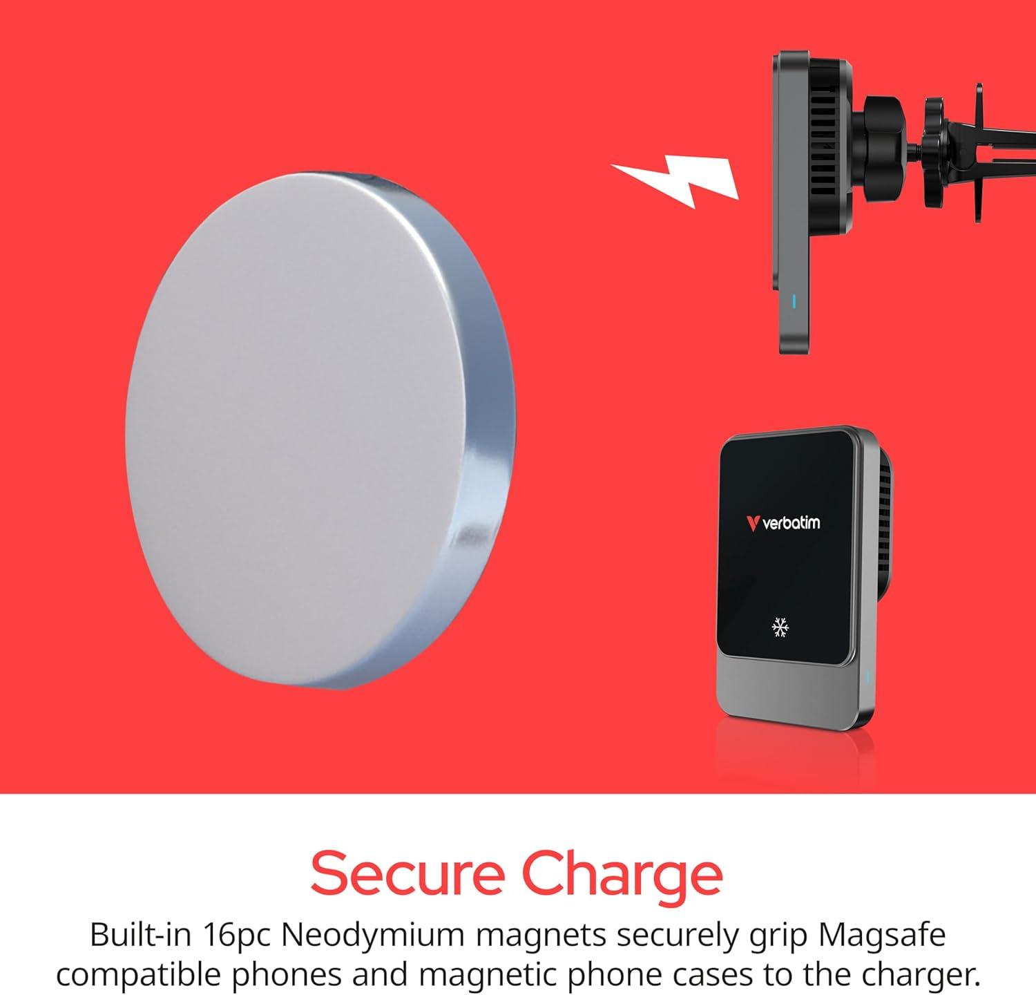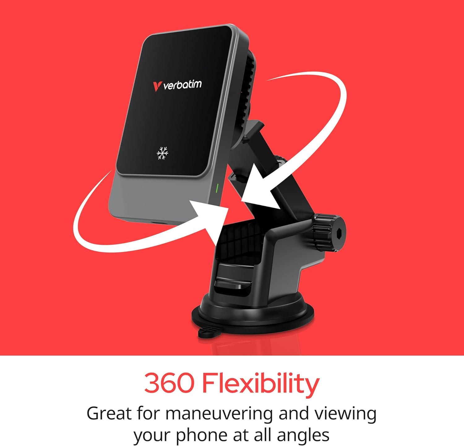 Effortlessly and safely charge your phone on the road with Verbatim's Charge 'n' Drive Magnetic Wireless Car Charger! Our Magsafe compatible wireless charger has built-in Neodymium magnets to securely grip Magsafe compatible phones and magnetic phone cases for fast charging. Our car charger also has inclusive, smart cooling fan and semiconductor chilling plate to prevent overheating. Easy installation of our charger helps you take advantage of rapid, secure wireless charging right away. Simply install the charger with the included vent clip, or with a telescopic arm and suction cup on your car's dashboard or windshield. The charger attaches to the mount with a 360-degree swivel ball, enabling full flexibility for viewing and maneuvering your phone at any angle. This sleek accessory, complete with a concave, tempered glass surface, makes for a smooth, stylish, hands-free connection as you focus on the road ahead!