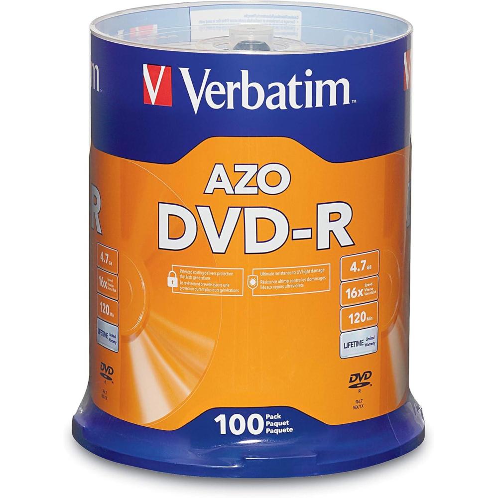 Verbatim DVD-R Blank Discs AZO Dye 4.7GB 16X Recordable Disc – 100 Pack Spindle,Silver(100Pk Discs)