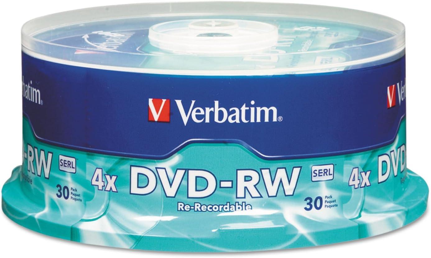 Verbatim 95179 DVD-RW 4.7GB 4X Branded 30pk Spindle, Verbatim DVD-RW offers 4.7GB or 120 Minutes of re-recordable storage capacity, superior recording quality, and compatibility with 1X to 4X DVD-RW writers. Verbatim 1X-4X DVD-RW is ideal for archiving or backing up 4.7GB of data or 120 minutes of DVD-quality video. Preferred by DVD drive manufacturers, Verbatim DVD-RW media utilizes Super Eutectic Recording Layer (SERL), which minimizes noise during write/rewrite cycles and provides superior archival stability. Verbatim 4X DVD-RW media is compatible with writers from Sony, Pioneer, Apple, Panasonic and other major DVD-R/-RW writers.