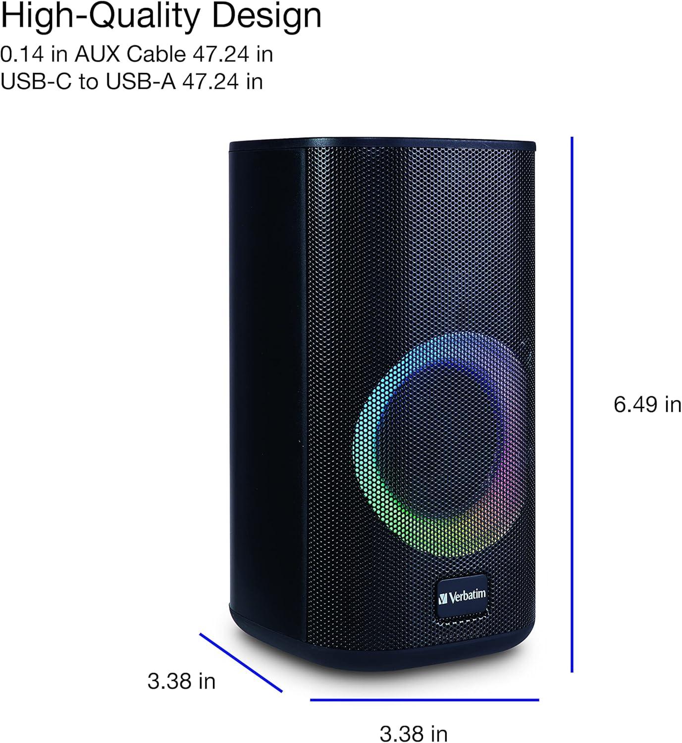 Get your game on and turn up the sound of victory with the Verbatim® RGB Gaming Stereo Desktop Speakers! These speakers deliver rich bass and clear treble, with 10W output power, to bring you high quality sound as you play your favorite game. Choose from five, 16.8 M RGB lighting modes to personalize your gaming experience with different colors. Use the one-touch switching feature to connect your computer, tablet, or smartphone via Bluetooth 5.0 or 3.5mm AUX-In connection. The Verbatim® RGB Gaming Stereo Desktop Speakers are backed by a 1-year limited warranty. Technical Specifications: Speaker Output 10W (5W*2) Frequency Response Range 100Hz – 20KHz Sensitivity 750mV ±50mV Operational Range Up to 30 meters Contents: (1 Set) RGB Gaming Stereo Desktop Speakers (1) USB-C to USB-A Cable (1) 3.5mm AUX Cable (1) User Manual