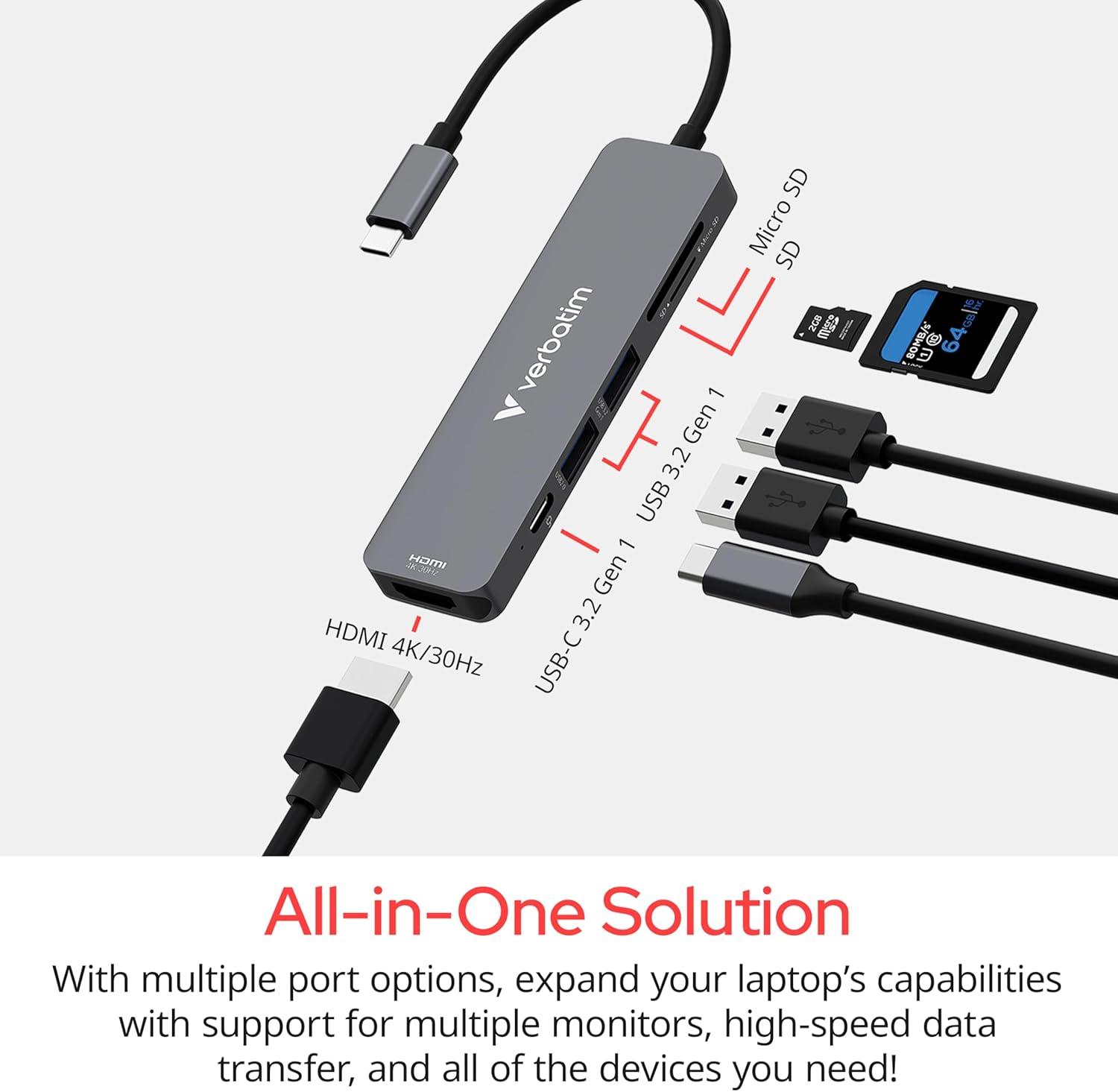 Verbatim USB-C Essentials Multiport Hub – 7 Ports: (2) USB-A 3.0/3.2 Gen 1, (2) USB-C 3.0/3.2 Gen 1, SD and Micro SD Card Slots with 4K HDMI and Up to 100W Power Delivery(6 Ports)