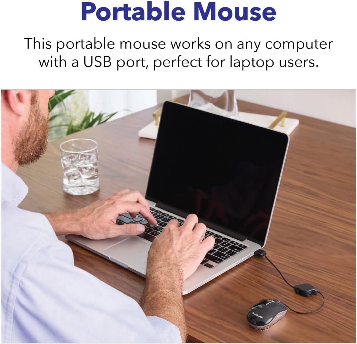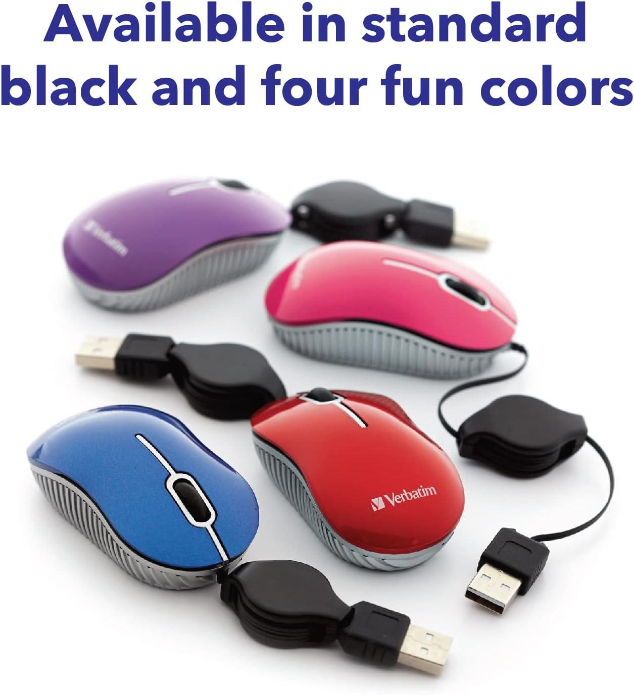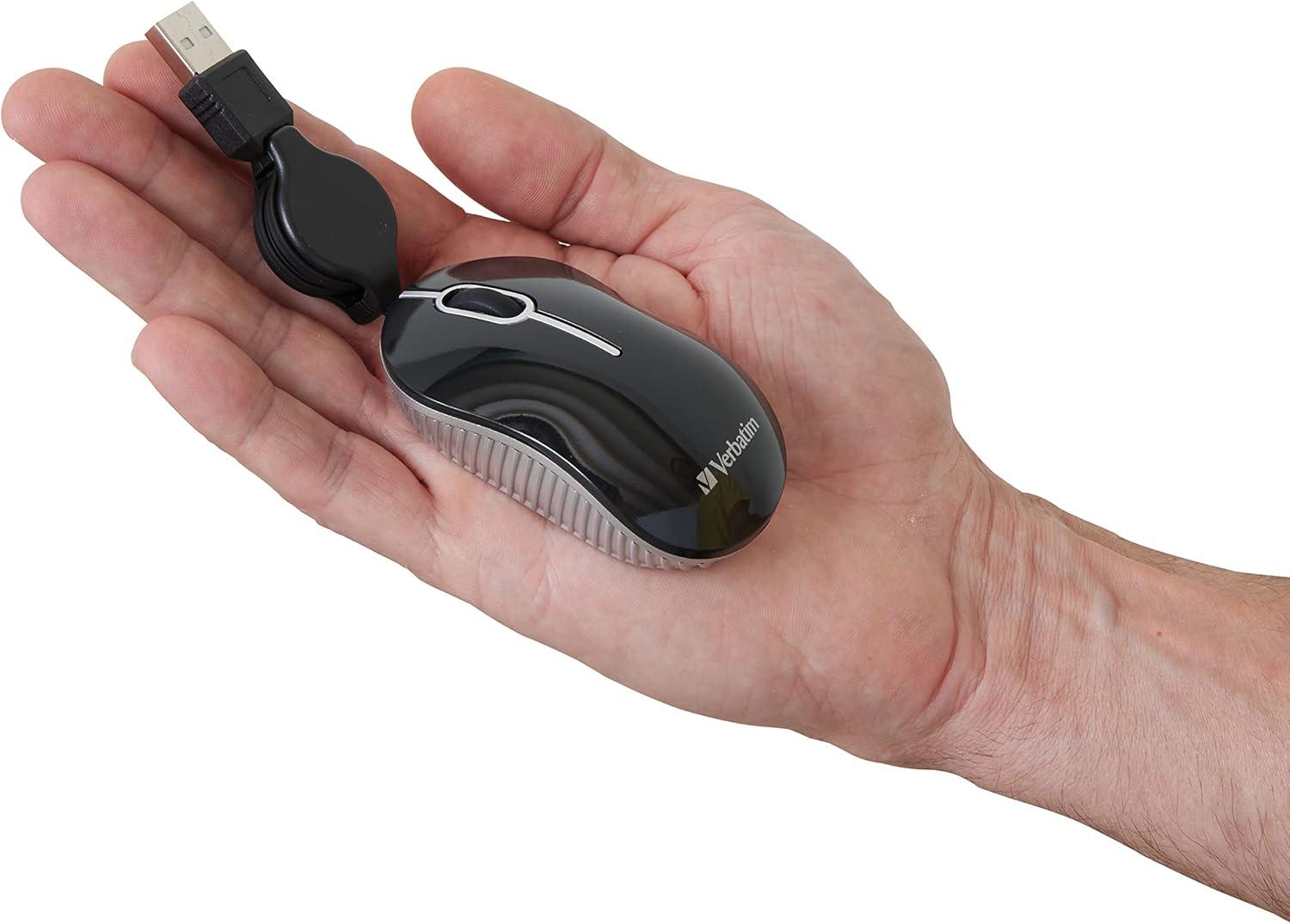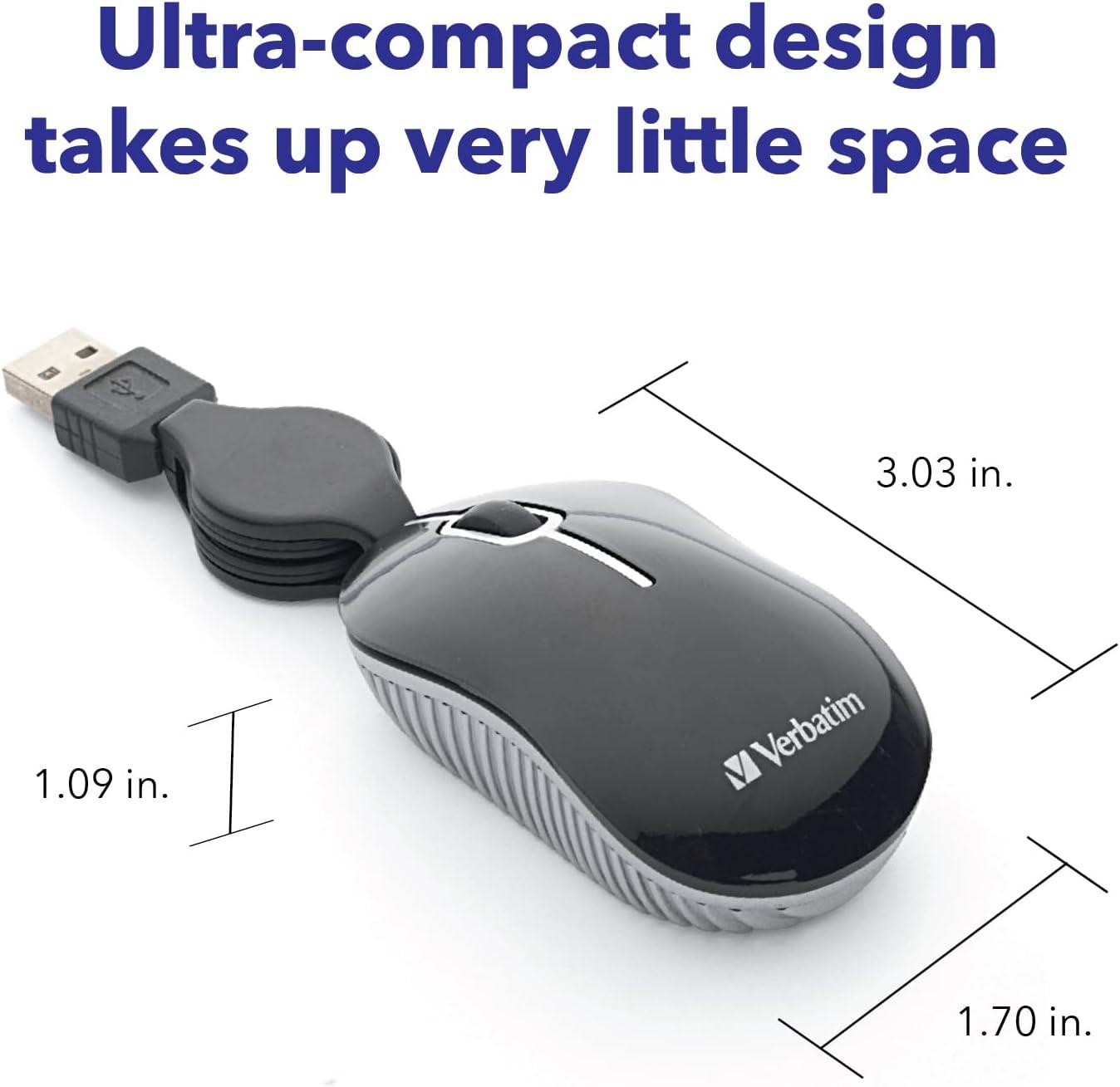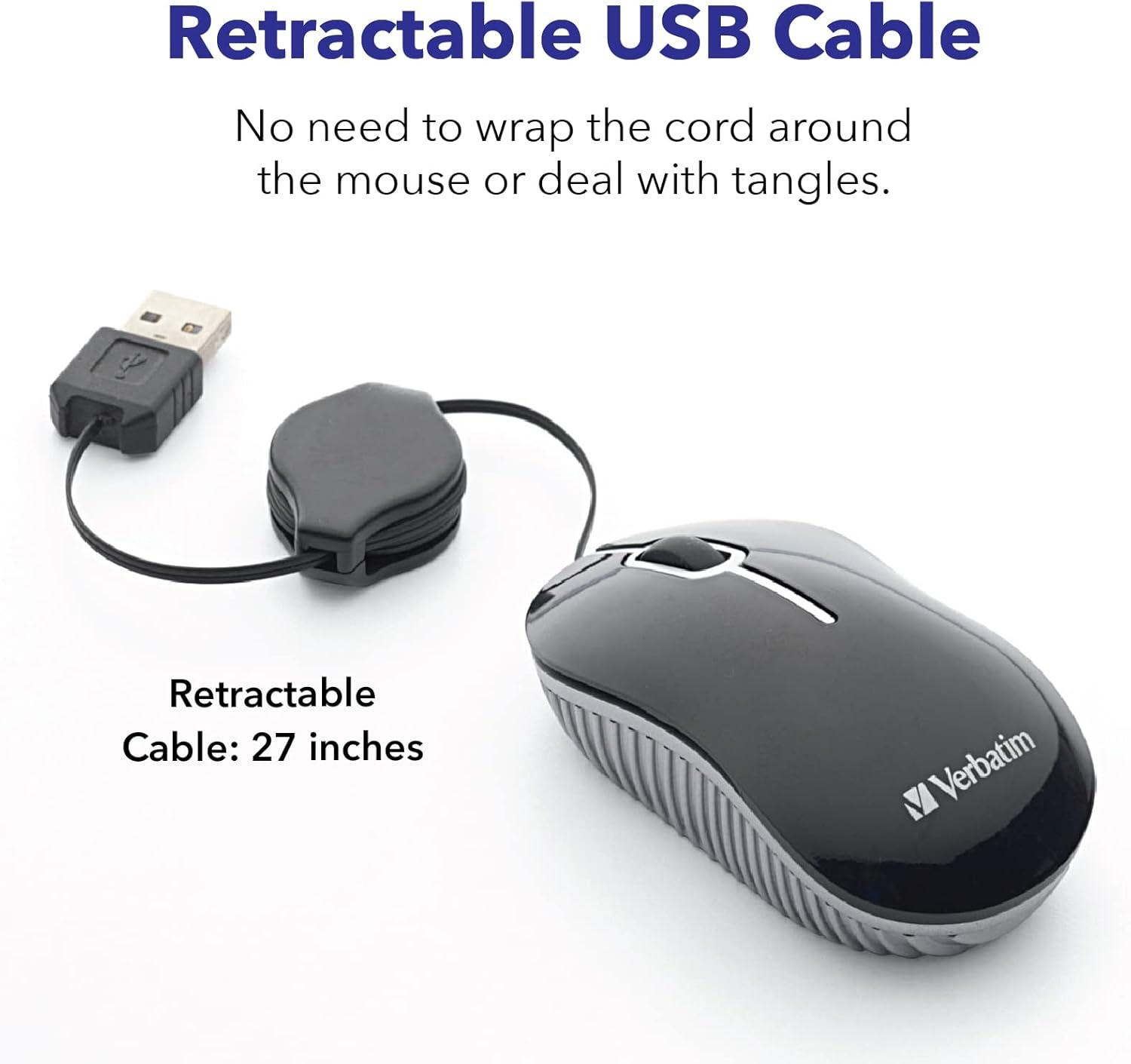 Verbatim Wired Optical Computer Mini USB-A Mouse – Plug & Play Corded Small Travel Mouse with Retractable Cable – Black 98113(BLACK)