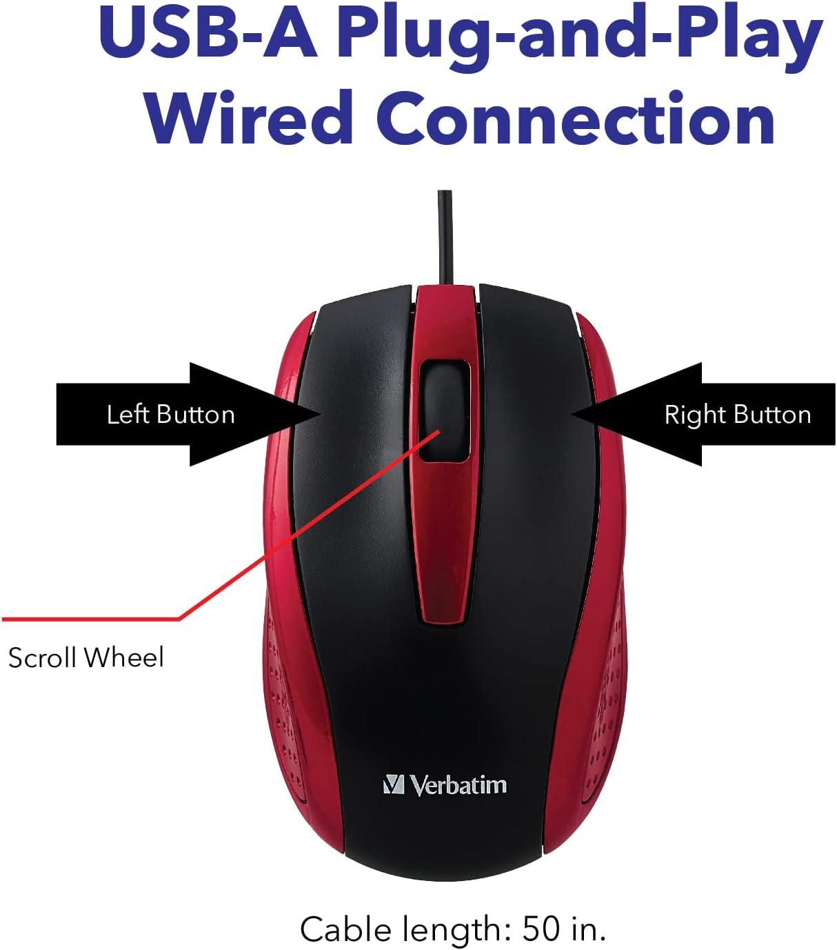 Verbatim Wired USB Computer Mouse - Corded USB Mouse for Laptops and PCs - Right or Left Hand Use, White 99740, 1.4" x 2.4" x 3.9"(Red)